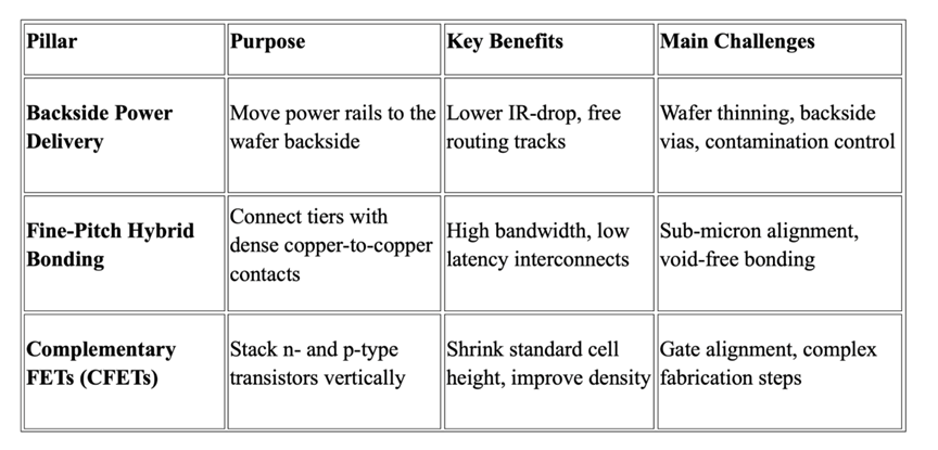 雖然堆疊晶圓的想法聽起來很簡單,但 CMOS 2.0 背后的四大技術支柱,每一項都與傳統半導體制造工藝有著顯著的不同。這些支柱共同定義了該方法的技術基礎,并凸顯了其前景廣闊卻又難以大規模實施的原因。