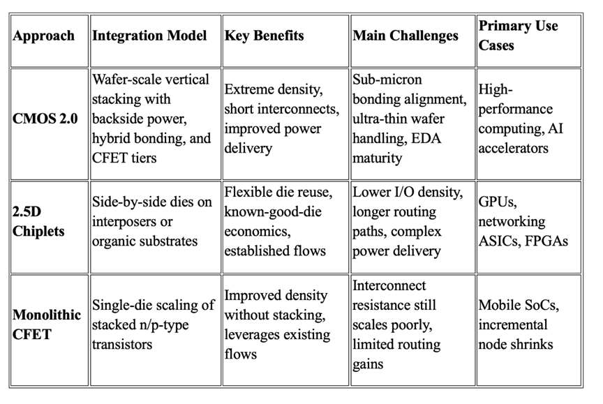CMOS 2.0 并非擴大規模的唯一策略。代工廠和系統公司也在大力投資其他替代方案,每種方案都有各自的優勢和利弊。