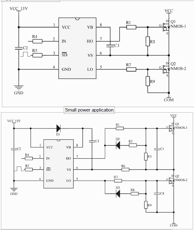 •主要特點(diǎn):集成自舉二極管;為自舉操作而設(shè)計(jì)的浮動通道;完全工作到+600V;容忍負(fù)瞬態(tài)電壓v /dt免疫;柵極驅(qū)動供電范圍從4.8到20v;欠壓鎖定;3.3V, 5V和15V輸入邏輯兼容;交叉?zhèn)鲗?dǎo)防止邏輯;內(nèi)部設(shè)置死區(qū)時間;高側(cè)輸出與輸入相一致