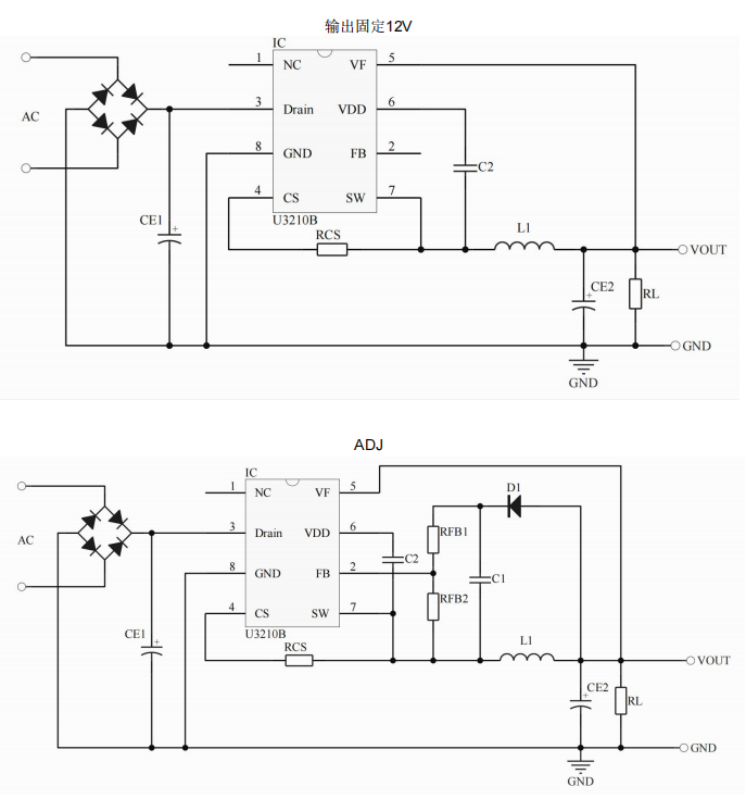 •主要特點(diǎn):集成9Ω,500V MOS ; 集成650V 高壓?jiǎn)?dòng)電路 ; 集成續(xù)流二極管 ; 多模式控制、無異音工作 ; 支持降壓和升降壓拓?fù)?/span> ; 默認(rèn)12V 輸出( FB 腳懸空) ; 待機(jī)功耗低于50mW ; 良好的線性調(diào)整率和負(fù)載調(diào)整率 ; 集成軟啟動(dòng)電路 ; 內(nèi)部保護(hù)功能:過載保護(hù) (OLP) 、 逐周期電流限制 (OCP) 、 輸出過壓保護(hù) (OVP) 、 VDD 過壓、欠壓和電壓箝位保護(hù)