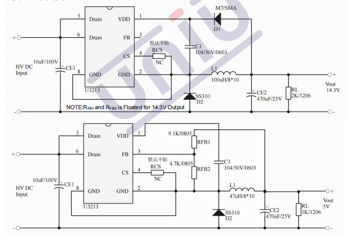 •主要特點(diǎn):集成 3A 160V MOS ;集成 180V 高壓啟動電路;集成限流電阻(默認(rèn)1.2A);多模式控制、無異音工作;支持降壓和升降壓拓?fù)洌荒J(rèn)14.3V輸出(FB 腳懸空);待機(jī)功耗低于 50mW;良好的線性調(diào)整率和負(fù)載調(diào)整率;集成軟啟動電路;內(nèi)部保護(hù)功能: 過載保護(hù)(OLP);逐周期電流限制(OCP);輸出過壓保護(hù)(OVP);VDD 過壓、欠壓和電壓箝位保護(hù)